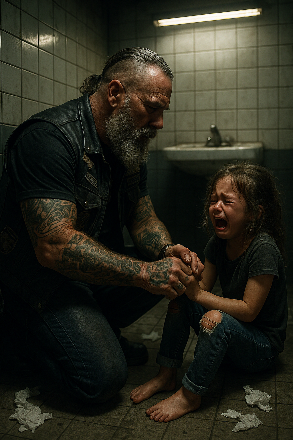 The Old Biker, at Midnight, Comes Across a Little Girl Hiding in a Restaurant Bathroom
