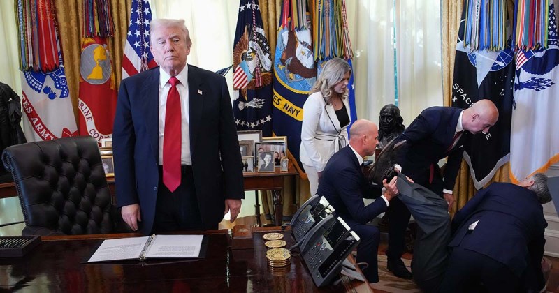 One Reddit user humorously commented: โJust swap the guy on the floor with America and you’ve got the official 2025 portrait.โ