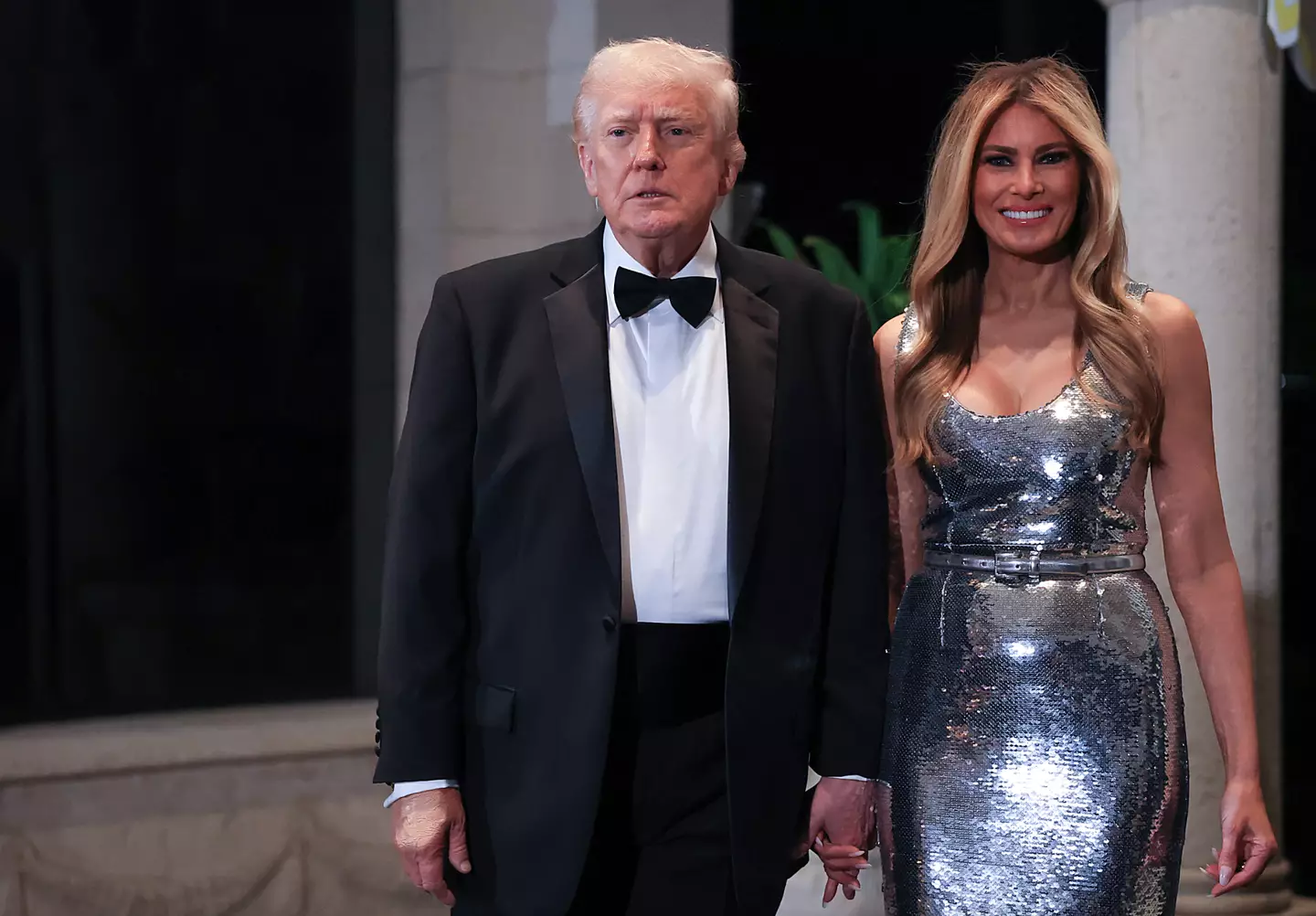 Melania stood out in a glittering silver dress complemented by sleek heels, whereas Donald wore a timeless tuxedo with a neat black bow tie, adding to the evening’s elegance.