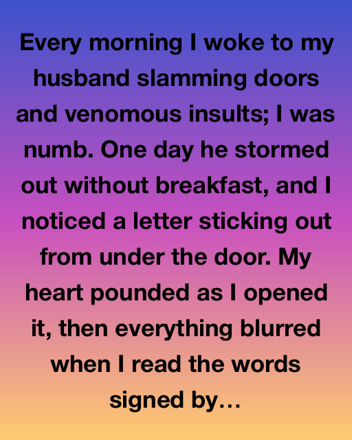 Every morning I woke to my husband slamming doors and venomous insults; I was numb. One day he stormed out without breakfast, and I noticed a letter sticking out from under the door. My heart pounded as I opened it, then everything blurred when I read the words signed by Hannah, my childhood friend.