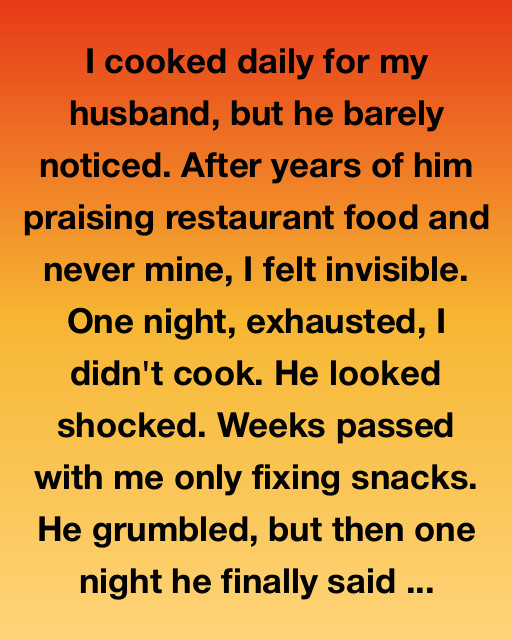 I cooked daily for my husband, but he barely noticed. After years of him praising restaurant food and never mine, I felt invisible. One night, exhausted, I didn’t cook. He looked shocked. Weeks passed with me only fixing snacks. He grumbled, but then one night he finally said,