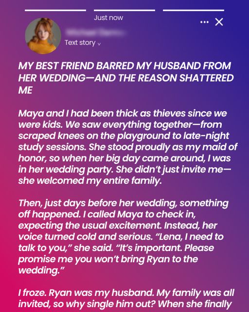 Looking back, the irony isn’t lost on me. Maya barring Ryan from her wedding felt like betrayal at first, but it turned out to be the purest act of friendship. She saved me from wasting more years on a man who didn’t deserve me.