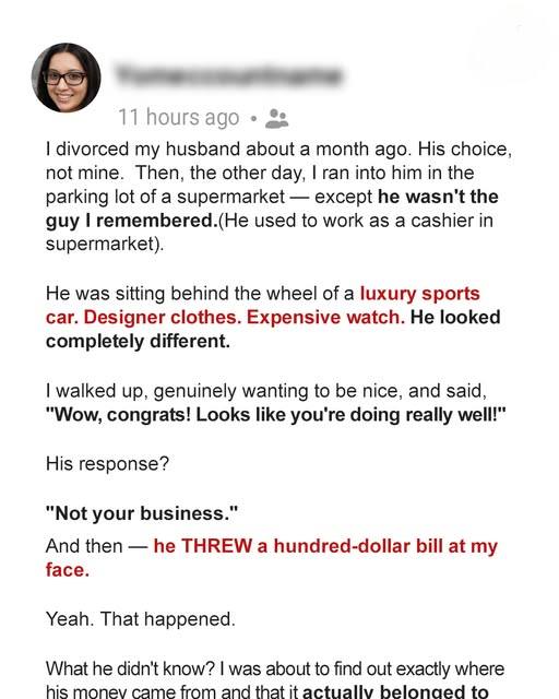 I stood there, frozen in the supermarket parking lot, as the hundred-dollar bill fluttered to the ground. My ex-husband, Marco, revved the engine of his sleek red sports car and smirked at me through his designer sunglasses before speeding off. A month ago, he had been a cashier at this very supermarket, barely scraping by, and now he looked like he had walked off the cover of a magazine.