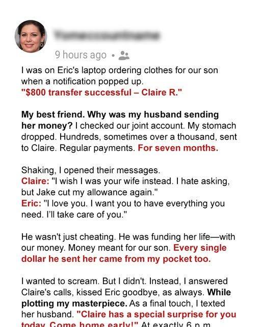 I stared at the screen, my vision blurring. This wasnโt just an affair. It wasnโt just a fling. He was supporting her. My best friend. With our money.