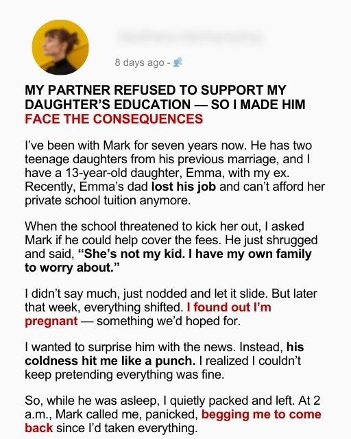 I’ve been with Mark for seven years now. He has two teenage daughters from his previous marriage, and I have a 13-year-old daughter, Emma, with my ex. Recently, Emma’s dad lost his job and can’t afford her private school tuition anymore.