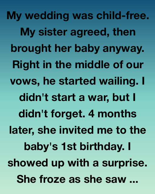 My wedding was child-free. My sister agreed, then brought her baby anyway. Right in the middle of our vows, he started wailing. I didn’t start a war, but I didn’t forget. Four months later, she invited me to the baby’s 1st birthday. I showed up with a surprise. She froze as she saw my ex-boyfriend walk through the door, carrying a huge stuffed giraffe and grinning like he’d just won the lottery.