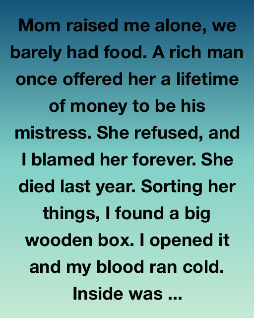 Mom raised me alone, we barely had food. A rich man once offered her a lifetime of money to be his mistress. She refused, and I blamed her forever. She died last year. Sorting her things, I found a big wooden box. I opened it and my blood ran cold. Inside was a stack of letters tied with a red ribbon, an old Polaroid photo of a man I didnโt recognize, and beneath that, a thick envelope filled with crisp hundred-dollar bills.