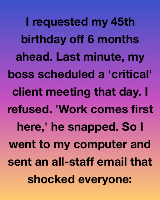 I requested my 45th birthday off 6 months ahead. Last minute, my boss scheduled a ‘critical’ client meeting that day. I refused. ‘Work comes first here,’ he snapped. So I went to my computer and sent an all-staff email that shocked everyone: