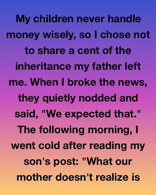 My children never handle money wisely, so I chose not to share a cent of the inheritance my father left me. When I broke the news, they quietly nodded and said, “We expected that.” The following morning, I went cold after reading my son’s post: “What our mother doesn’t realize is that the money she’s clinging to is a fraction of what we earn every quarter, and she’s been unknowingly living off our ‘unwise’ earnings for the last three years.“