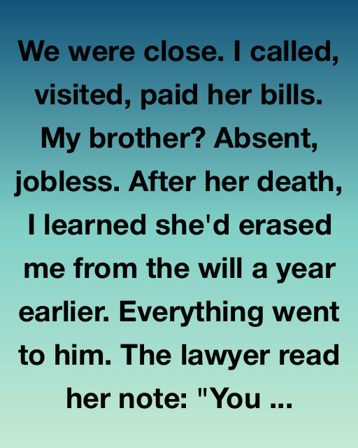 We were close. I called, visited, paid her bills. My brother? Absent, jobless. After her death, I learned she’d erased me from the will a year earlier. Everything went to him. The lawyer read her note: “You always took care of me, and I wanted your brother to finally feel responsible for something.”