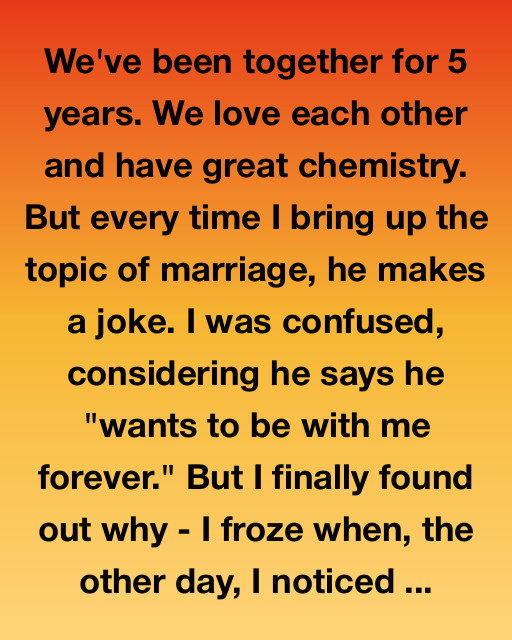We’ve been together for 5 years. We love each other and have great chemistry. But every time I bring up the topic of marriage, he makes a joke. I was confused, considering he says he “wants to be with me forever.” But I finally found out whyโI froze when, the other day, I noticed a little velvet box pushed to the back of his sock drawer.