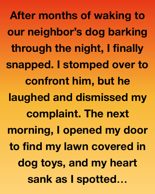 After months of waking to our neighborโ€™s dog barking through the night, I finally snapped. I stomped over to confront him, but he laughed and dismissed my complaint. The next morning, I opened my door to find my lawn covered in dog toys, and my heart sank as I spotted new ones scattered all around.
