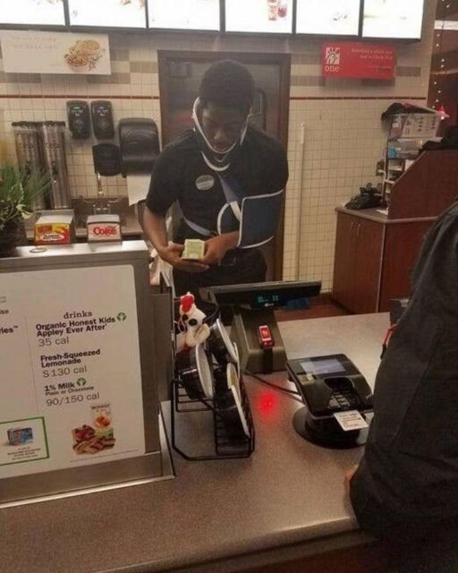 But behind the counter was a young man in a neck brace and sling. In pain. Still smiling. Still working.