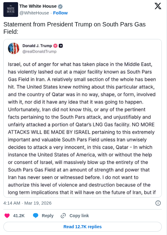 “NO MORE ATTACKS WILL BE MADE BY ISRAEL pertaining to this extremely important and valuable South Pars Field unless Iran unwisely decides to attack a very innocent, in this case, Qatar – In which instance the United States of America, with or without the help or consent of Israel, will massively blow up the entirety of the South Pars Gas Field at an amount of strength and power that Iran has never seen or witnessed before.”