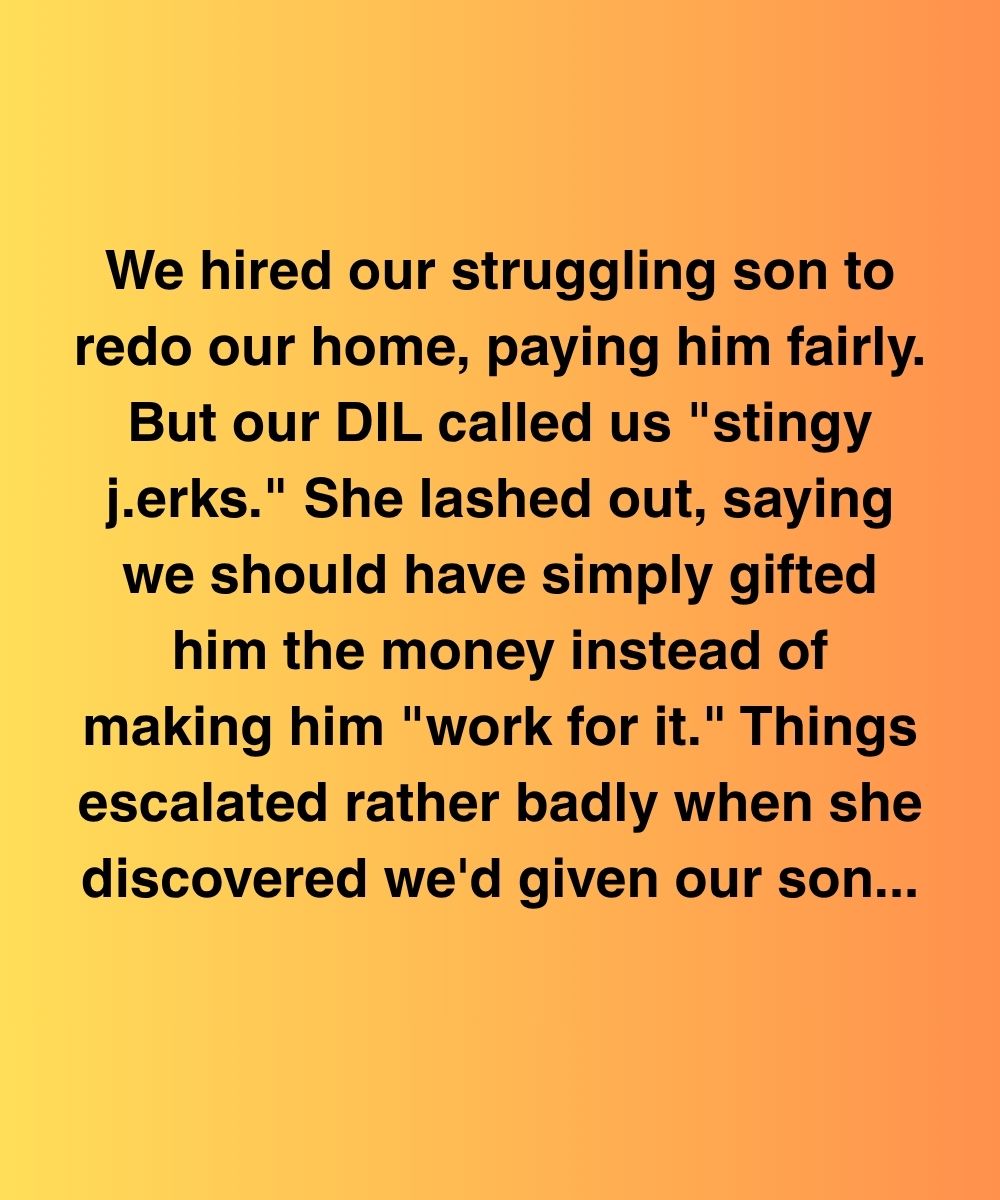 We hired our struggling son to redo our home, paying him fairly. But our DIL called us “stingy jerks.” She lashed out, saying we should have simply gifted him the money instead of making him “work for it.” Things escalated rather badly when she discovered we’d given our son a $12,000 bonus he never told her about.