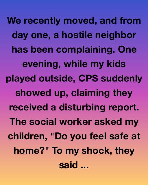 We recently moved, and from day one, a hostile neighbor has been complaining. One evening, while my kids played outside, CPS suddenly showed up, claiming they received a disturbing report. The social worker asked my children, “Do you feel safe at home?” To my shock, they said “Yes, of course!” but then the social worker looked at me with a mix of suspicion and confusion.